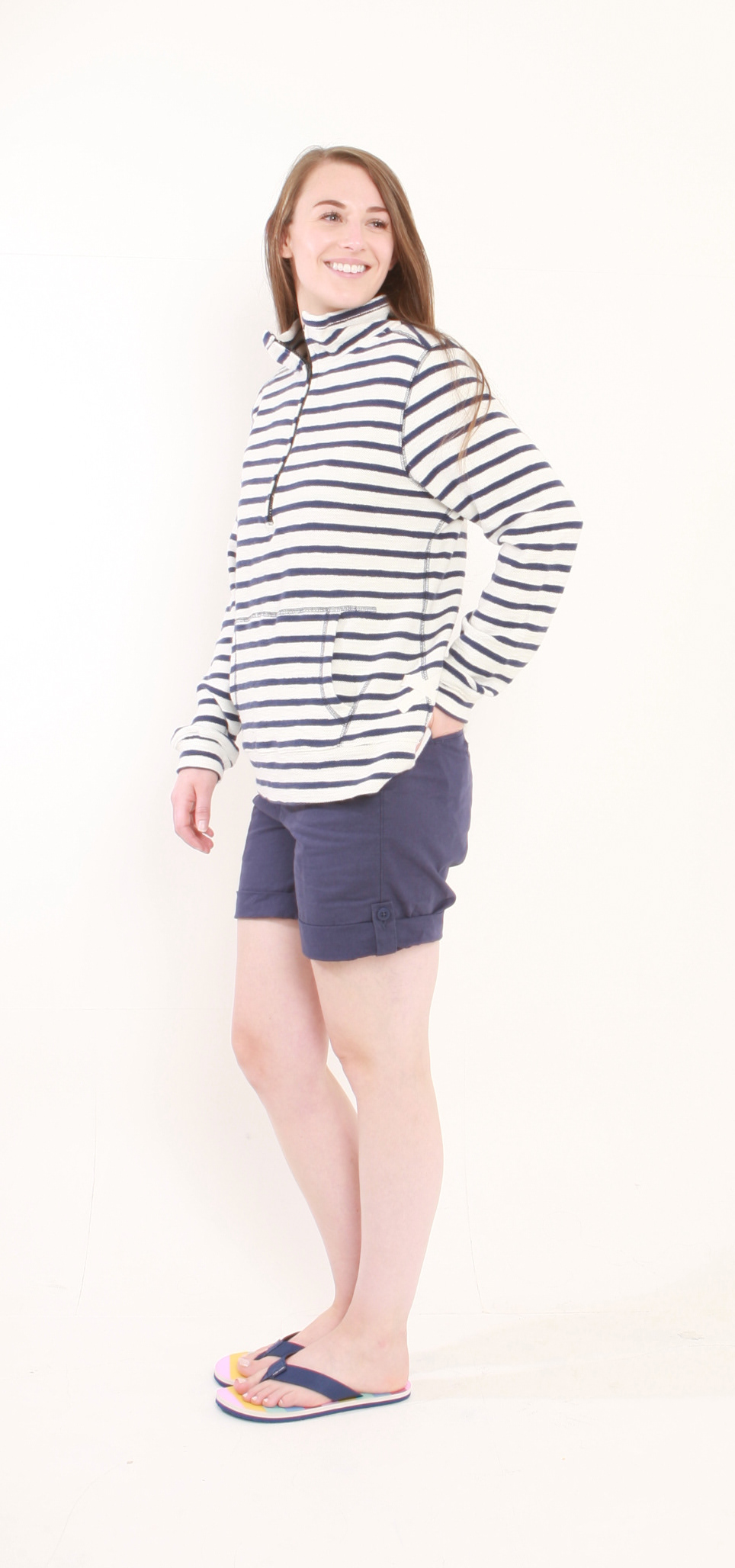 Studio image as taken (left) and edited (right) with skin smoothed, shine taken off face, shadow of eyelashes on face removed, hair removed from covering arm of garment. Background lightened, image brightened and contrast increased to better represent garment colour.